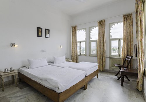 Jaiwana Haveli has total 24 elegantly appointed guestrooms. All the rooms are tastefully designed to assure a comfortable stay. The hotel offers a breathtaking view of the famous lake Pichola and surrounding Aravali hill ranges from its terrace. The hotel is 4 storied and has a Roof-top Restaurant. It is accessible by stairs only. All rooms in the hotel are standard rooms and offer basic amenities. We suggest that you book 3-4 months in advance to get rooms on a higher floor. The hotel does not guarantee view from the rooms. All rooms are equipped with Air-conditioners, LCD's and attached bathrooms with 24 hours hot water. The hotel is in easy walking distance to all popular monuments, the Pichola lake, bazaars, gardens and restaurants. It's located in a very popular locality called 'Lalghat' on the eastern shore of the Pichola Lake.